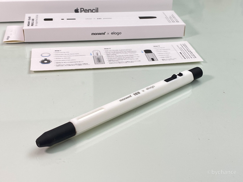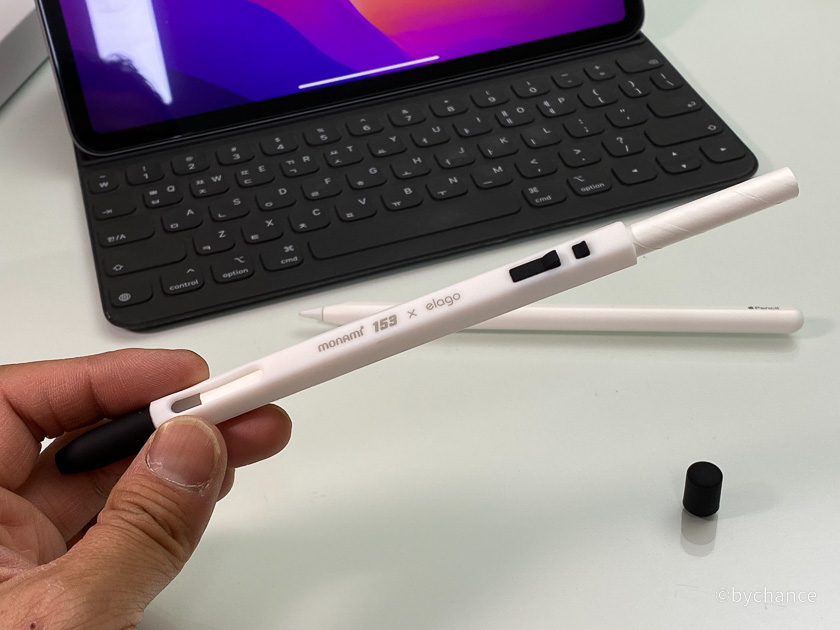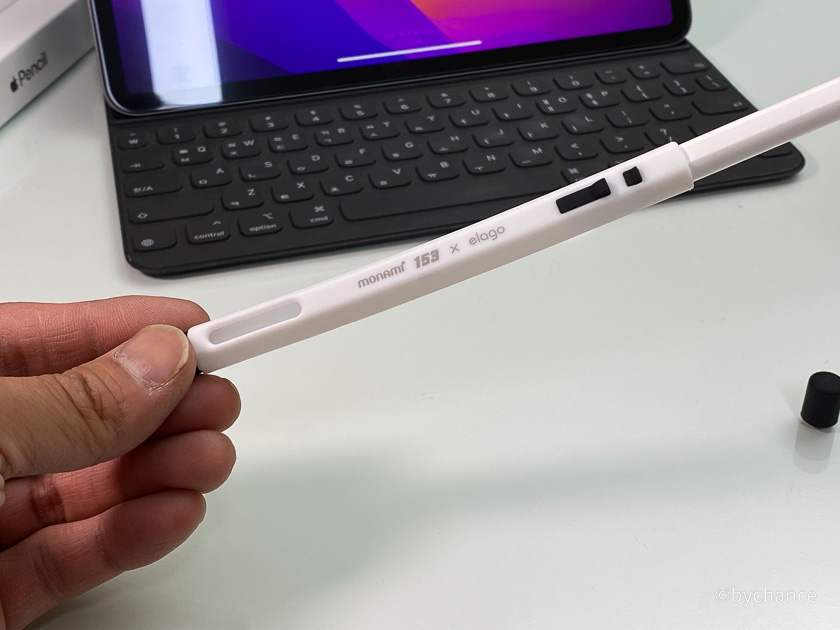 애플펜슬 2세대를 한번 떨어뜨려 망가진 경험이 있어 보호 차원에서 실리콘 케이스를 찾고 있었다. 그러다 마음에 드는 케이스를 찾았는데, 그것은 바로 엘라고에서 나온 모나미 153 볼펜 모양의 실리콘 케이스이다. 사진으로 보면 모나미 볼펜과 비슷해 보이지만 아무래도 애플펜슬 케이스다 보니 실제 모나미 볼펜보다 훨씬 크다.